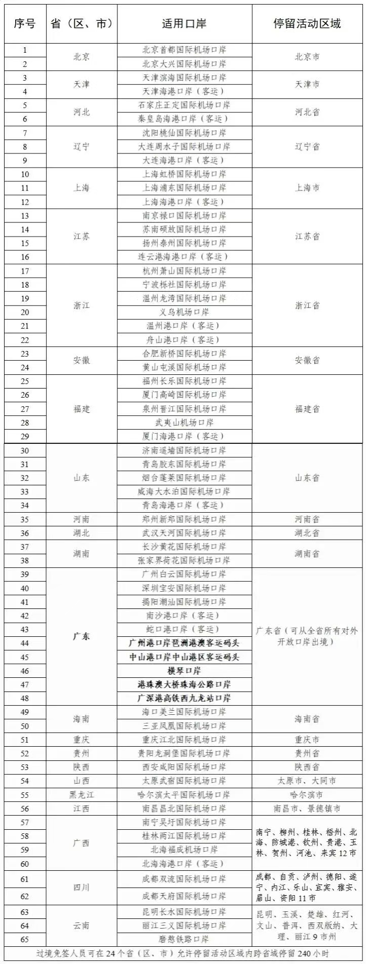 六、增加广东省5个口岸为240小时过境免签政策入境口岸。自2025年11月5日起,增加广州琶洲客运港、横琴、港珠澳大桥、中山港、广深港高铁西九龙站等5个口岸为240小时过境免签政策适用入境口岸,适用240小时过境免签的入境口岸总数由60个增加至65个。适用过境免签政策的55国公民持有效国际旅行证件和确定日期及行程的联程客票,从中国过境前往第三国(地区),可从24个省(自治区、直辖市)65个开放口岸中任一口岸免签入境,并在规定区域停留活动不超过240小时。停留期间可从事旅游、商务、访问、探亲等活动,工作、学习、新闻采访等需事先批准的活动仍应办妥签证方可入境。符合与我国签署互免签证协定或我单方面免签政策的,可从其规定。