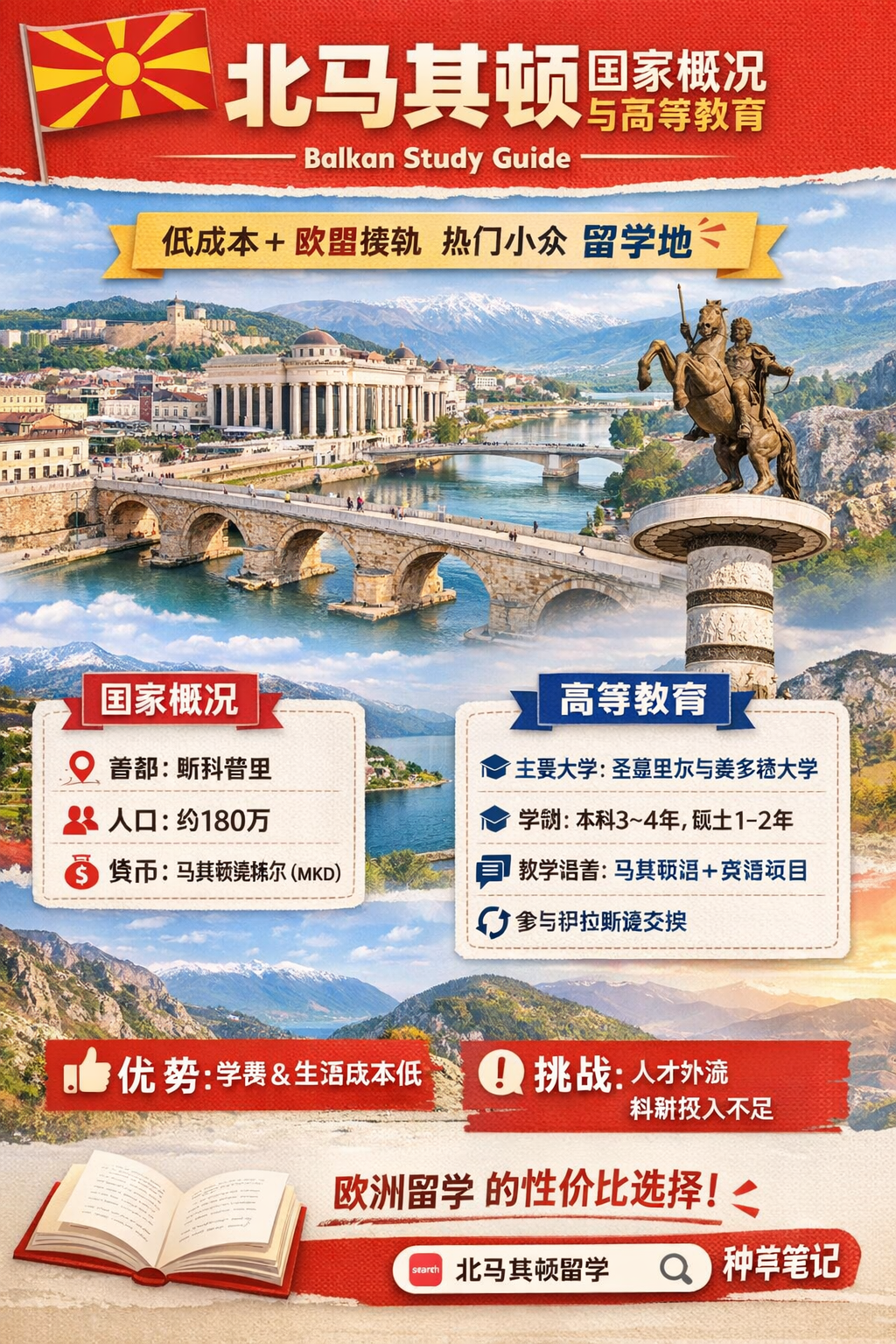 北马其顿是一个小而开放的巴尔干国家,教育体系欧洲化。凭借低成本 + 欧盟接轨 + 地理位置优势,在区域内具有一定吸引力,尤其适合预算有限且希望进入欧洲体系的学生。