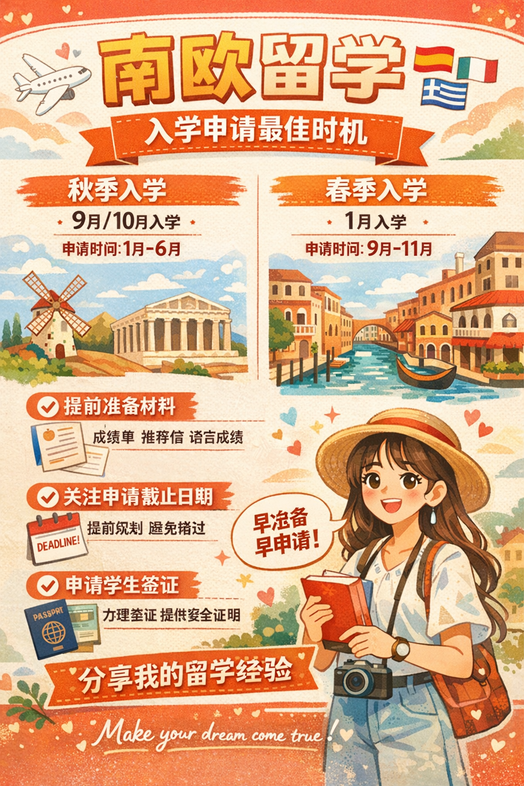 申请时间: 大多数南欧国家的秋季学期从9月或10月开始,申请的截止日期通常在前一年的1月到6月之间。具体日期取决于学校和学位项目。
