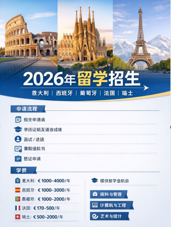 这几个国家——意大利、西班牙、葡萄牙、法国和瑞士——都是欧洲非常受欢迎的留学目的地,每个国家在教育、生活质量、学费、文化以及语言方面都有各自的特点。